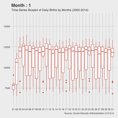 The following three figures are created based on the dataset births_2000_2014_SSA_USA.csv that contains U.S. births data for the years 2000 to 2014, as provided by the Social Security Administration.